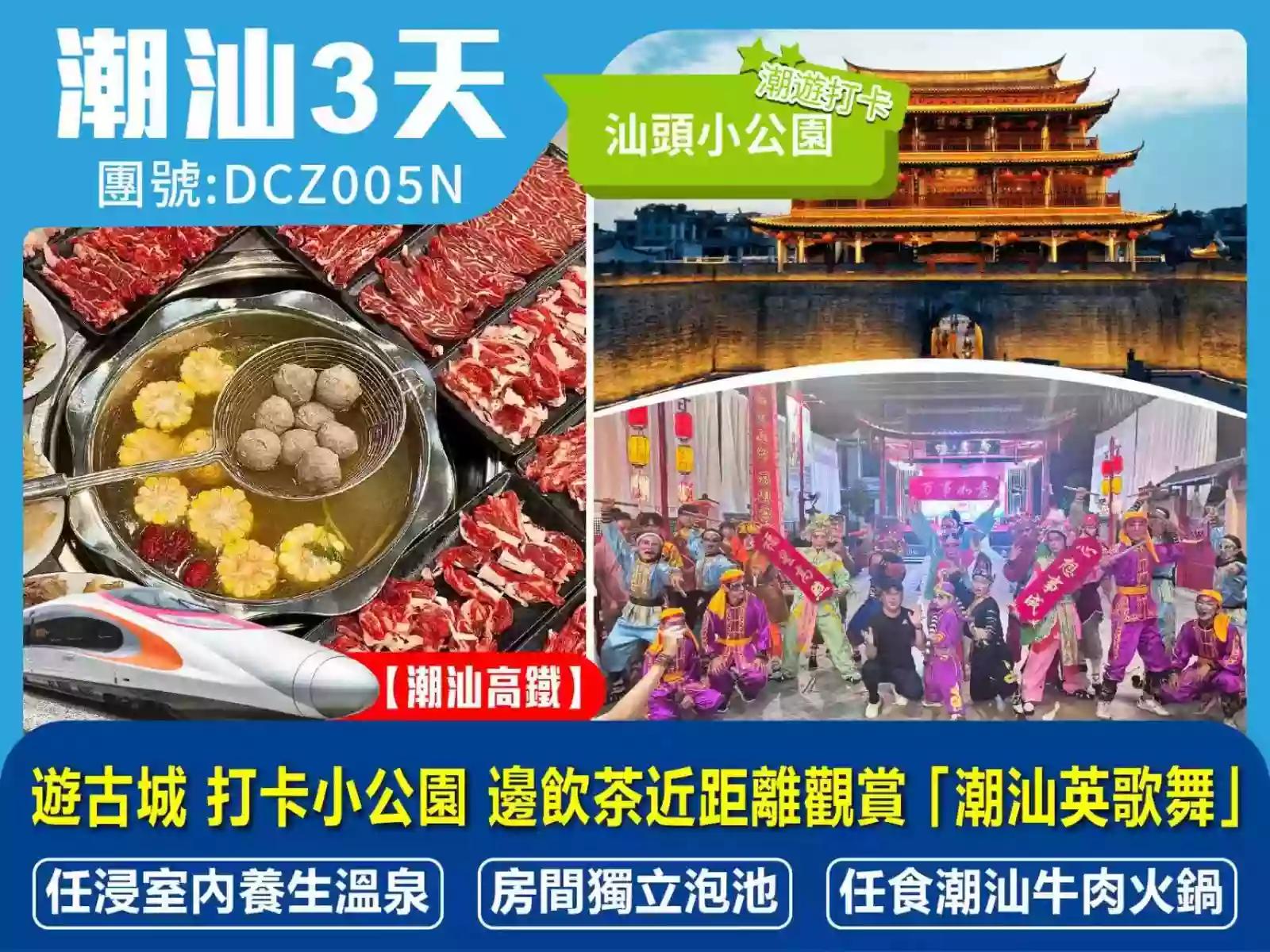 【潮汕高鐵往返】遊古城、打卡小公園 邊飲茶近距離觀賞「非遺演藝·潮汕英歌舞」 兩晚連住潮州精緻民宿 尊享房間獨立泡池 任浸室內養生溫泉 細意安排「古城地道下午茶、每人一份潮汕手信」3天