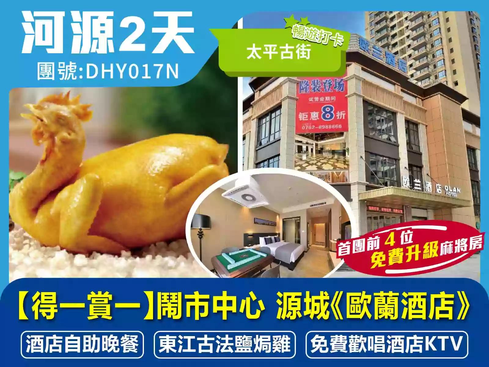 【得一賞一】鬧市中心 源城《歐蘭酒店》歎【酒店自助晚餐、東江古法鹽焗雞】免費歡唱酒店KTV 河源2天