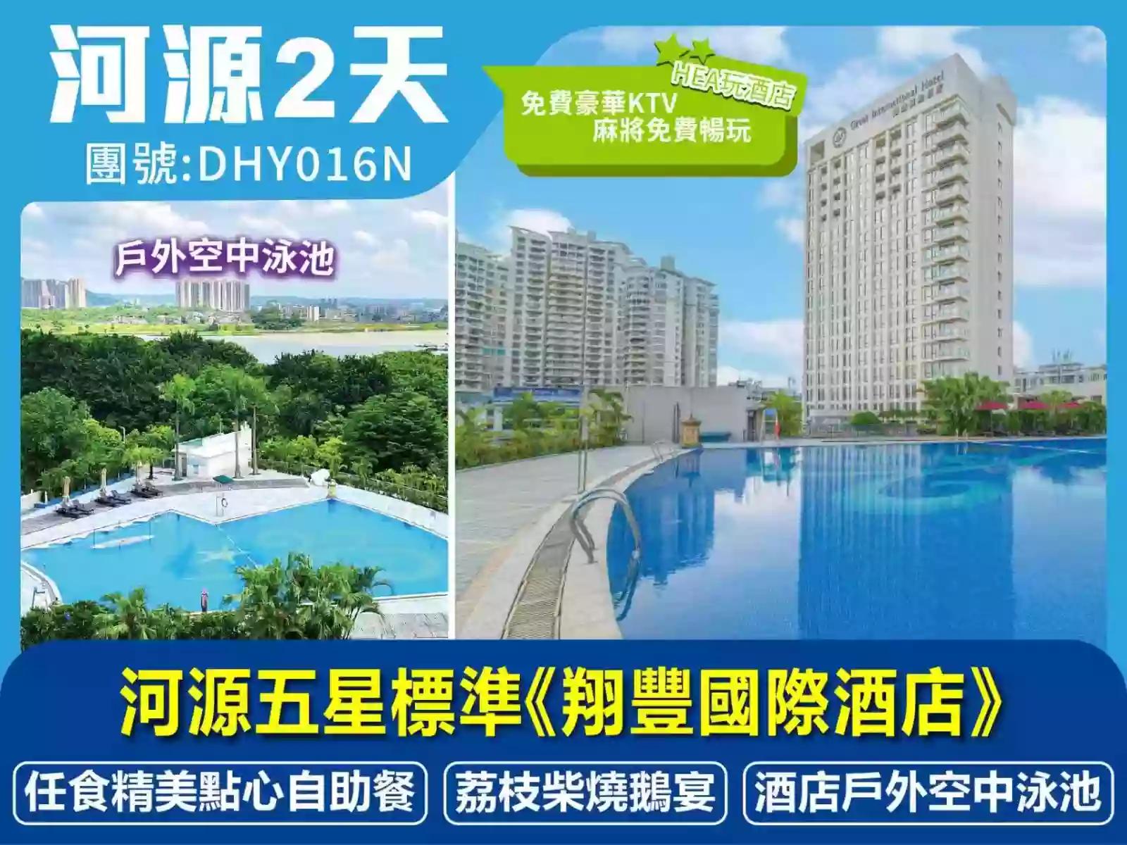 河源五星標準《翔豐國際酒店》【任食精美點心自助餐】 品嚐精緻【傳統客家迎客宴】免費歡唱KTV/暢玩麻將 河源2天