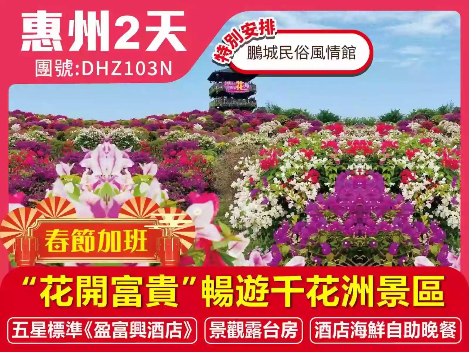“花開富貴”暢遊千花洲景區 歎【酒店海鮮自助晚餐、荔枝柴燒鵝鮑魚宴】五星標準《盈富興酒店》入住景觀露台房 惠州2天