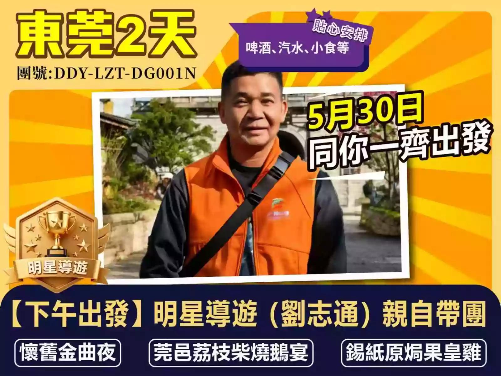【下午出發】明星導遊(劉志通)親自帶團 「懷舊金曲夜」聽歌互動齊齊玩 任食當季荔枝 東莞2天