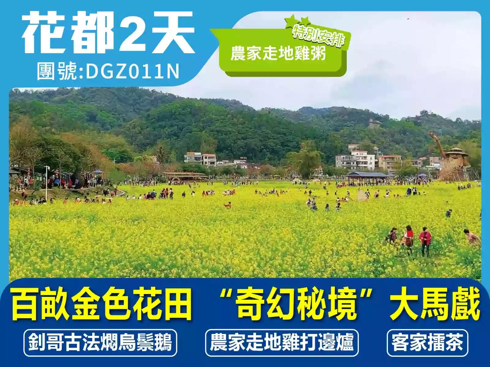 百畝金色花田 “奇幻秘境”大馬戲(重本包入場)品【廿年老字號:釗哥古法燜烏鬃鵝】歎【客家擂茶】下午茶 花都2天