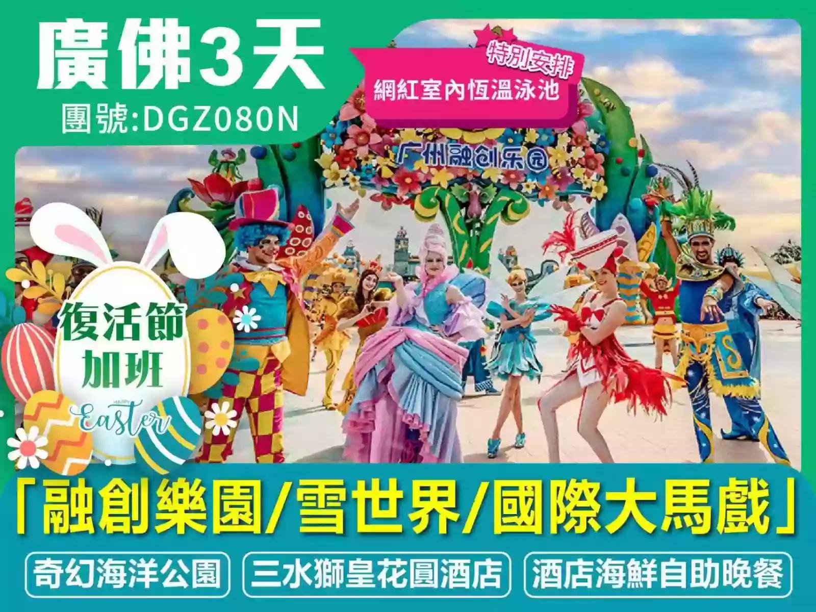 【復活節加班】重本包入場四大樂園「融創雪世界」、「融創樂園」、「融創國際大馬戲」、「奇幻海洋公園」入住佛山五星標準《三水獅皇花圓酒店》歎【酒店海鮮自助晚餐】廣州佛山3天