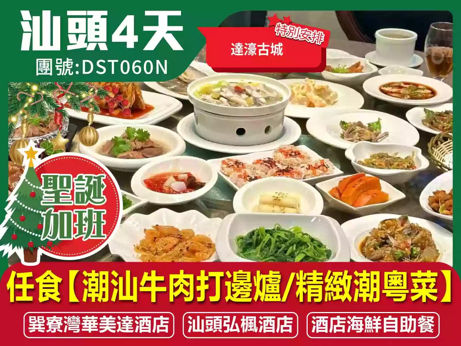 【〈聖誕節加班〉下午出發一口價半自遊行】任食【潮汕牛肉打邊爐、精緻潮粵菜】特別安排一天汕頭自遊行 潮人歎自助餐放煙花過聖誕 4天