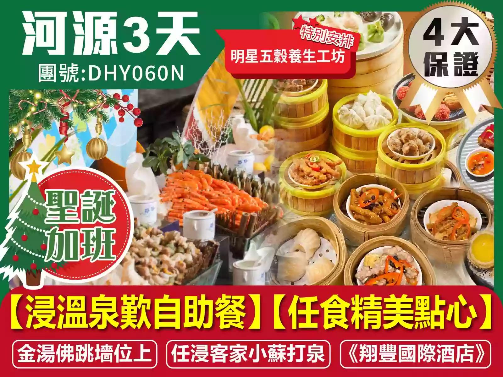 【〈聖誕節加班〉浸溫泉歎自助餐】無限任浸客家小蘇打泉 即點即做【任食精美點心】品【金湯佛跳墻位上】歎【酒店自助晚餐】河源標準《翔豐國際酒店》3天