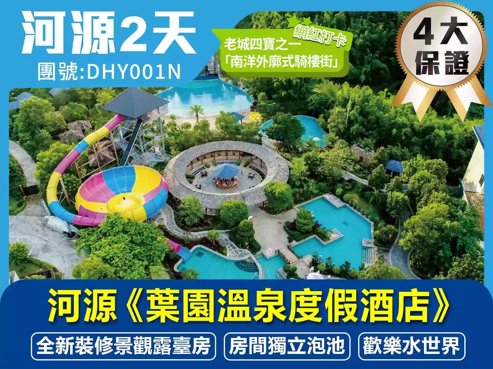 【溫泉水樂園】2晚連住 河源《葉園溫泉度假酒店》尊享獨立泡池房 充裕時間暢玩歡樂水世界 歎酒店自助下午茶 品客邑美食3天