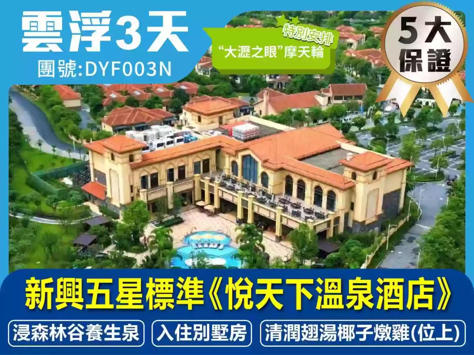 新興五星標準《悅天下溫泉酒店》浸森林谷養生泉 特別安排乘坐“大瀝之眼”摩天輪 打卡新晉地標“八寶錦盒”歎順德私房菜【清潤翅湯椰子燉雞(位上)】新興佛山3天