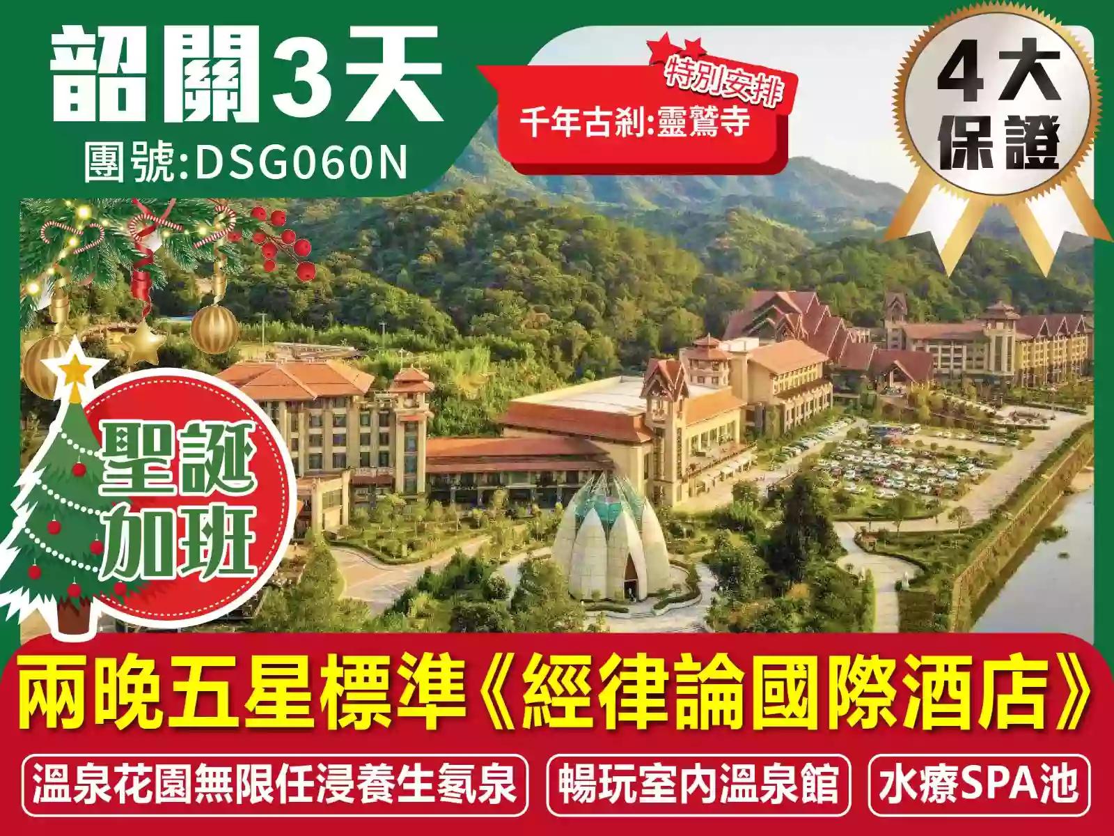 【〈聖誕節加班〉浸溫泉】兩晚連住韶關五星標準《經律論國際酒店》溫泉花園無限任浸養生氡泉 暢玩室內溫泉館 千年古剎:靈鷲寺 韶關3天