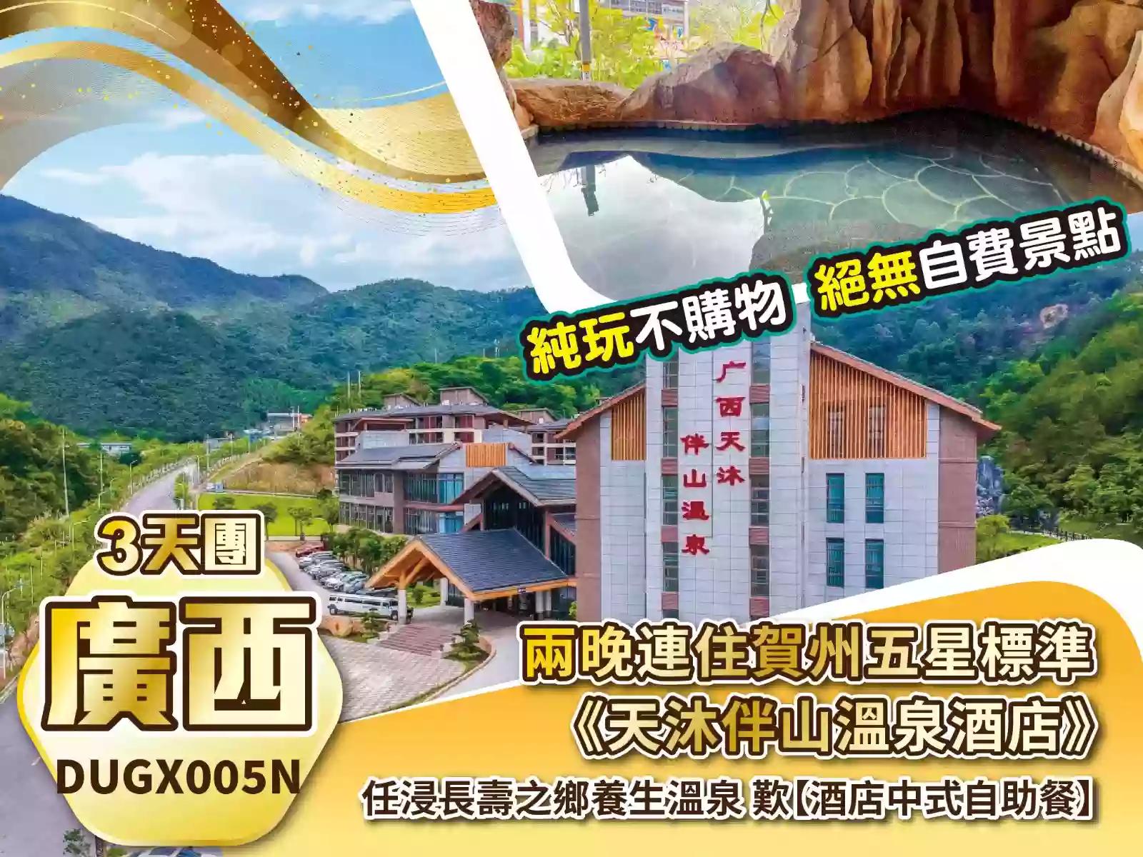 兩晚連住賀州五星標準《天沐伴山溫泉酒店》享房間獨立溫泉泡池 任浸長壽之鄉養生溫泉 歎【酒店中式自助餐】賀州3天