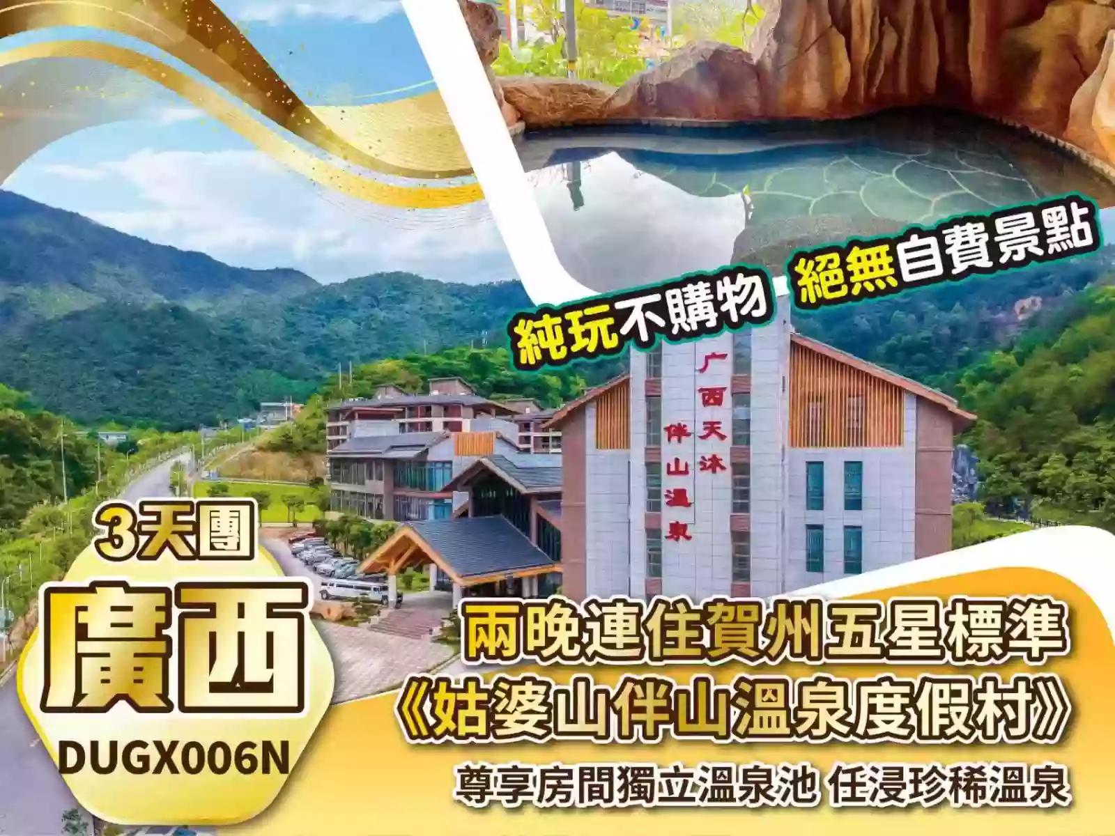 兩晚連住賀州五星標準《姑婆山伴山溫泉度假村》尊享房間獨立溫泉池 任浸珍稀溫泉 賀州3天