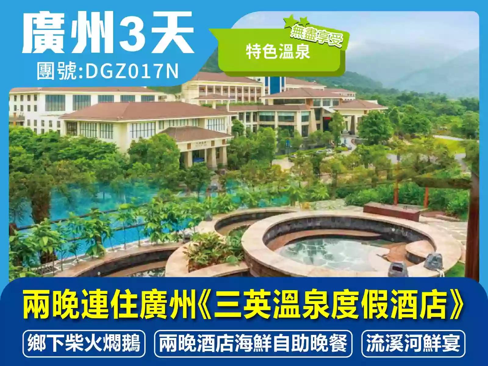 兩晚連住廣州《三英溫泉度假酒店》暢泳山泉水泳池 動感水療區 歎兩晚【酒店海鮮自助晚餐】嚐鄉下柴火美食 廣州3天